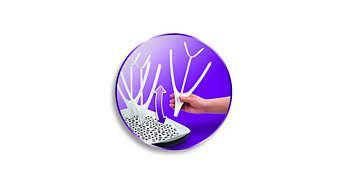 A Philips Avent szárítóállvány segít, hogy kisbabád cumisüvegeit és annak tartozékait a legtisztább és legrendezettebb módon tudd megszárítani. Rugalmas kialakításával, levehető cseppfelfogó tálcájával és bármekkora méretű üveget elbíró nagyságával ez az eszköz remek megoldást kínál a mindennapjaidhoz.