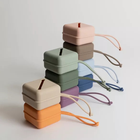 A négyzetes szilikon cumitartó akár 3 darab BIBS cumi tárolására is alkalmas. Könnyen felakaszthatod pelenkázótáskára vagy babakocsira is akár.