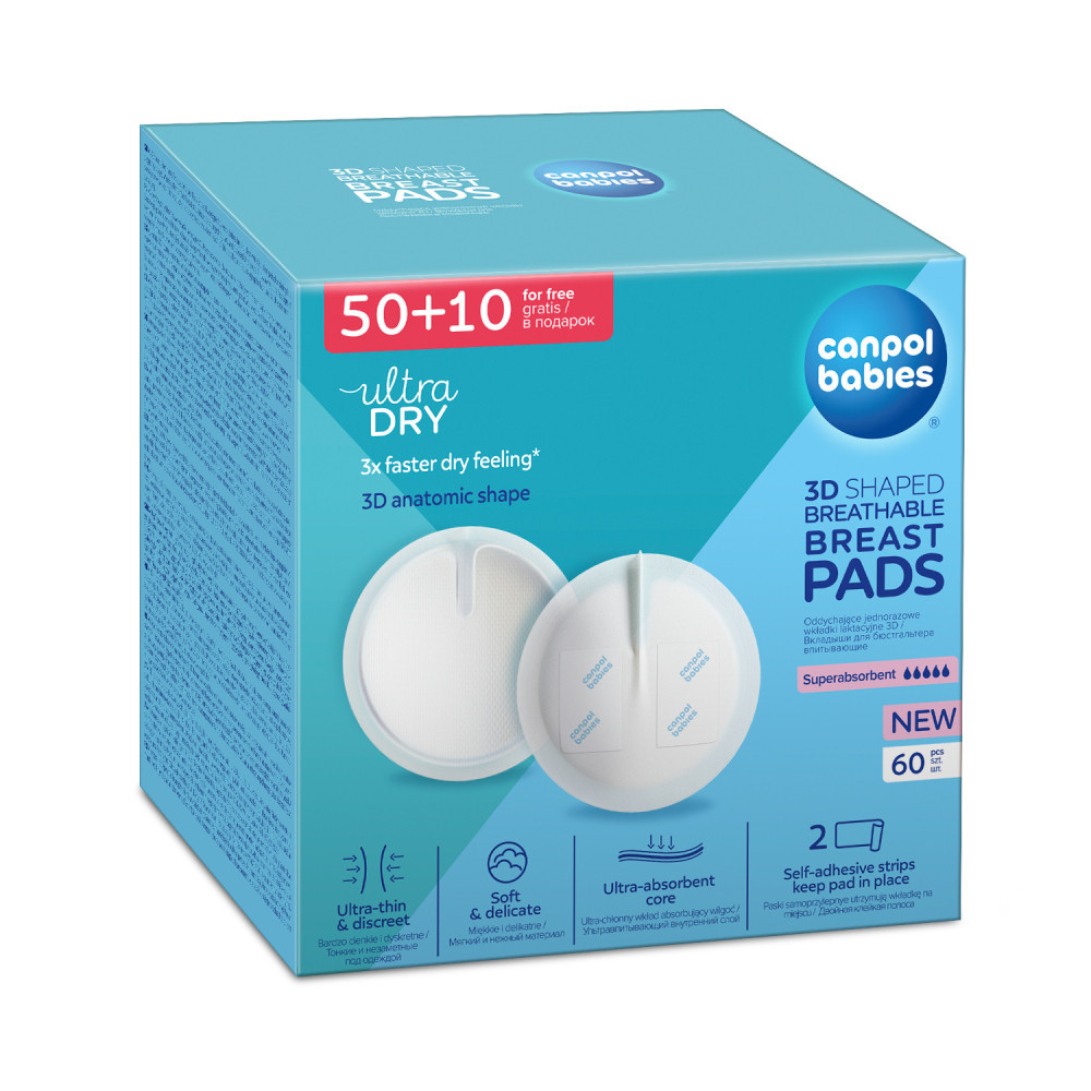 A Canpol babies kontúrozott, légáteresztő, eldobható 3D melltartóbetéteket a terhesség későbbi szakaszában lévő nők és szoptatós anyák számára tervezték. Nem irritálják a mell körüli érzékeny bőrt és a mellbimbókat.