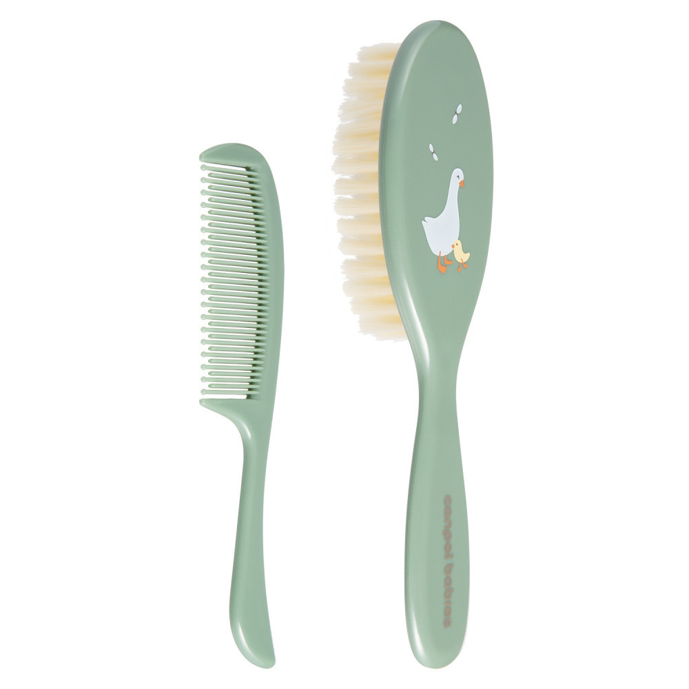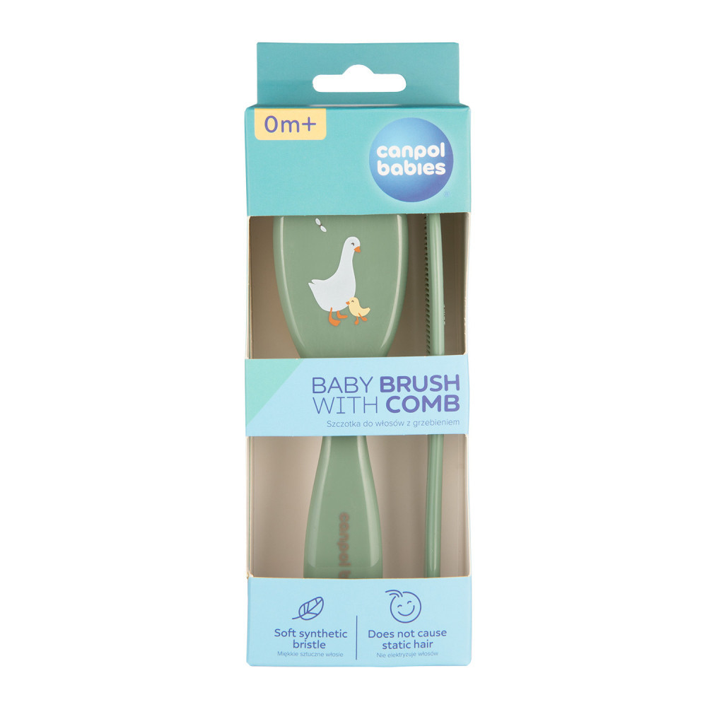 A szett egy puha sörtés hajkefét egy fésűt tartalmaz a baba hajának mindennapi ápolásához. A fésűnek lekerekített fogai vannak, amelyek nem irritálják a baba érzékeny bőrét. A kefe gyengéden masszírozza a baba fejét anélkül, hogy a hajat feltöltené elektromosággal. Tökéletes a születés utáni első napoktól kezdve. Többféle színben kapható.