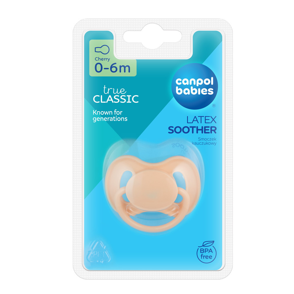 A Canpol babies cseresznye alakú, kaucsuk cumi, természetes kaucsukból készült, ezért színe sárgás és matt. Pajzsán található szellőzőnyílások lehetővé teszik a levegő áramlását, így megelőzik kisbabád szája körüli bőrirritációt.