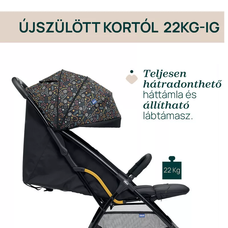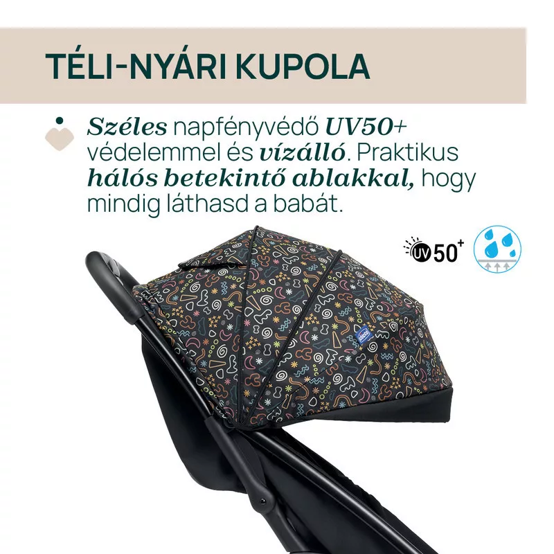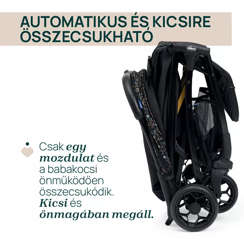 A Chicco Glee babakocsi egy kézzel, pillanatok alatt összecsukható, és önmagában megáll – így szuperpraktikus utazáshoz, városi közlekedéshez vagy kisebb autók csomagtartójába is.