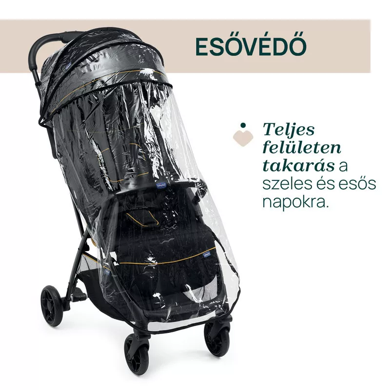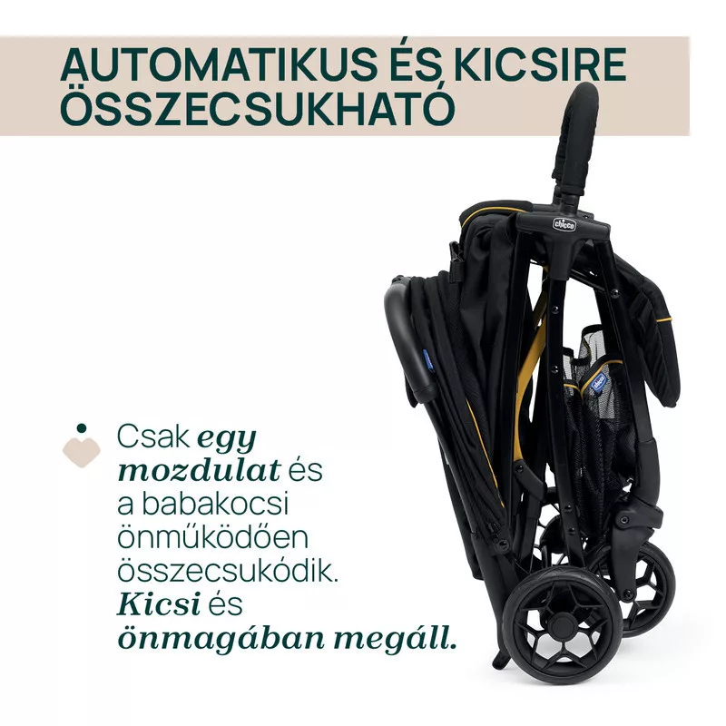 A Chicco Glee babakocsi egy kézzel, pillanatok alatt összecsukható, és önmagában megáll – így szuperpraktikus utazáshoz, városi közlekedéshez vagy kisebb autók csomagtartójába is.