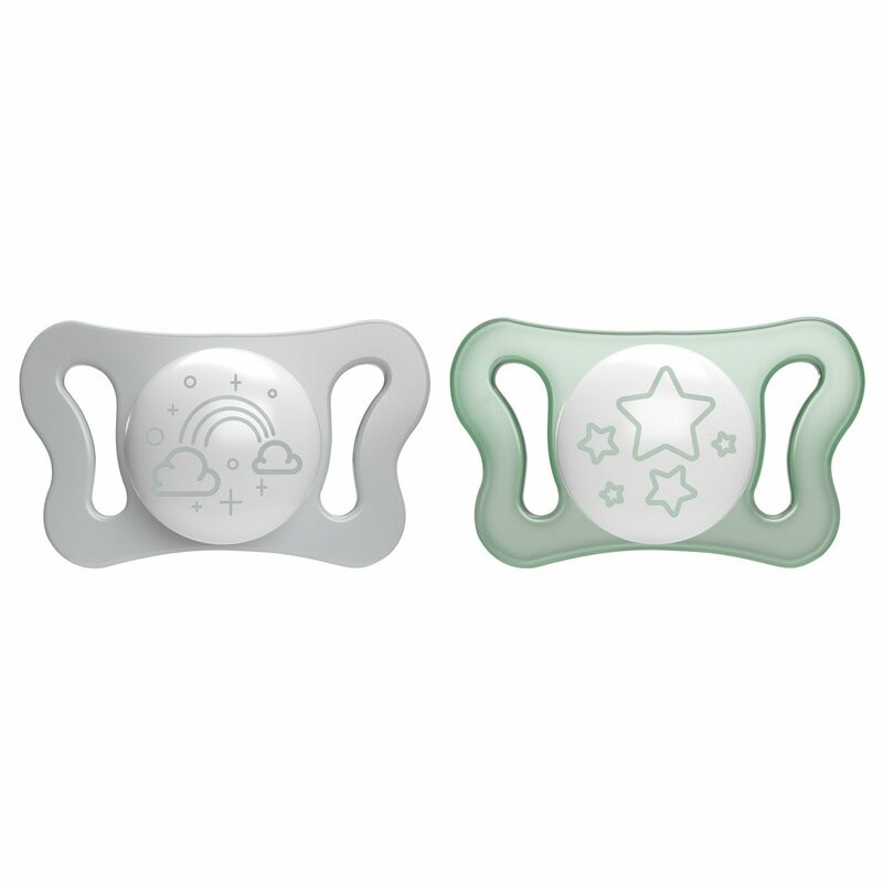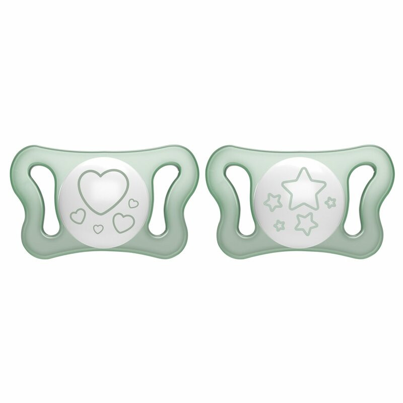 A sötétben foszforeszkáló pajzs segíti a cumi gyors megtalálását babád körül az éjszaka közepén. A cumit kifejezetten újszülötted apró szájához, nyelvéhez és szájpadlásához tervezték, az első 2 hónapra, kisbabád önmegnyugtató eszközeként.