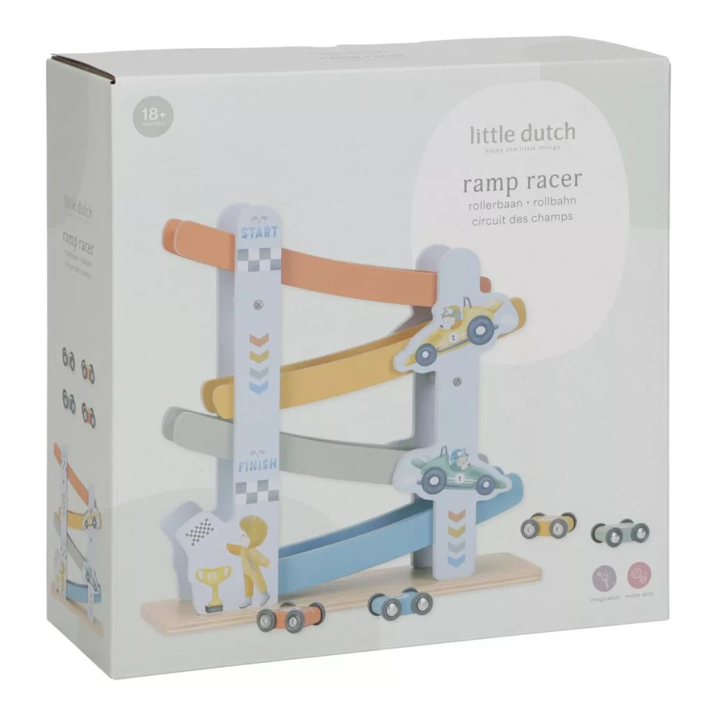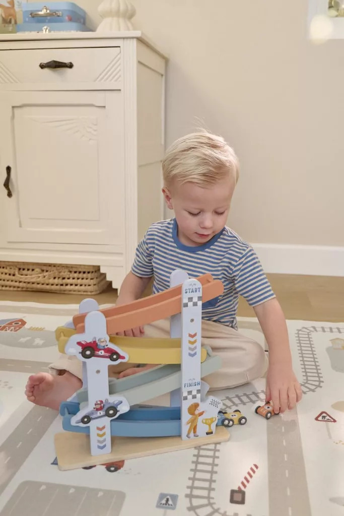 Ez a fából készült rámpás versenypálya magával ragadó játékot kínál a gyerekeknek, ahol játékautók száguldanak le a rámpákon teljes sebességgel.