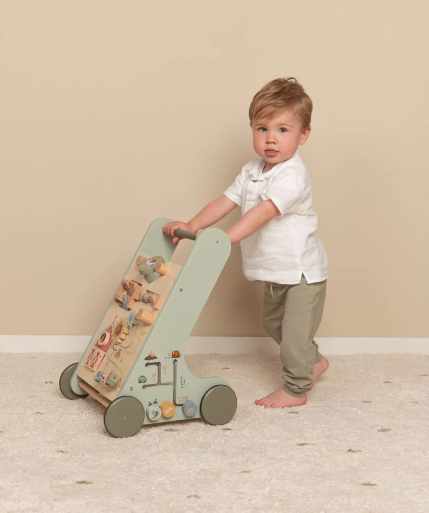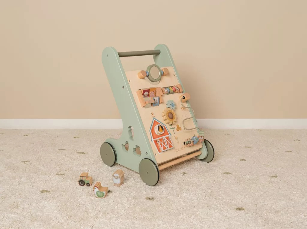 Ez a gyönyörű fa járássegítő nemcsak a járni tanuló kicsiknek nyújt stabil támaszt, hanem tele van izgalmas, fejlesztő játékelemekkel is.