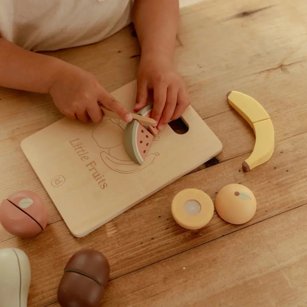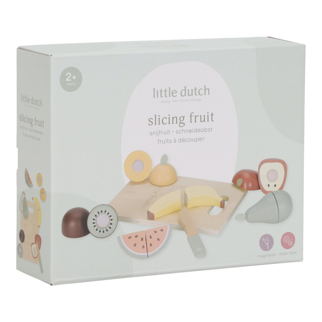 Készíts finom gyümölcstálat a játékkonyhában! A Little Dutch fa vágható gyümölcskészlet hatféle színes, vidám gyümölcsöt tartalmaz, amelyekkel gyermeked játékosan megismerkedhet az egészséges táplálkozás világával. A darabokat a fa késsel ketté lehet vágni, majd a tépőzár segítségével könnyedén újra összerakni.