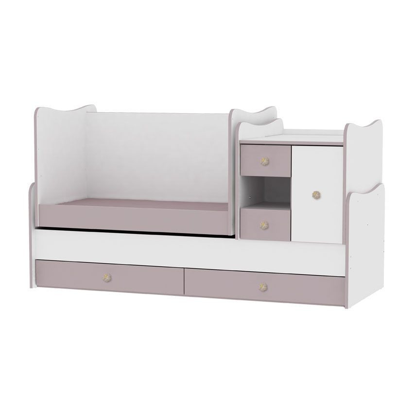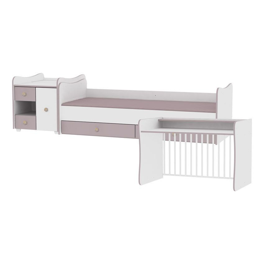 - A kombi ágy egyszerre babaágy és pelenkázó komód, nincs szükség két külön bútordarabra. Amikor a gyereknek már nincs szüksége rácsos kiságyra, a komód és a rácsok levételével egyszerűen átalakítható ifjúsági ágy keretté és éjjeliszekrénnyé.