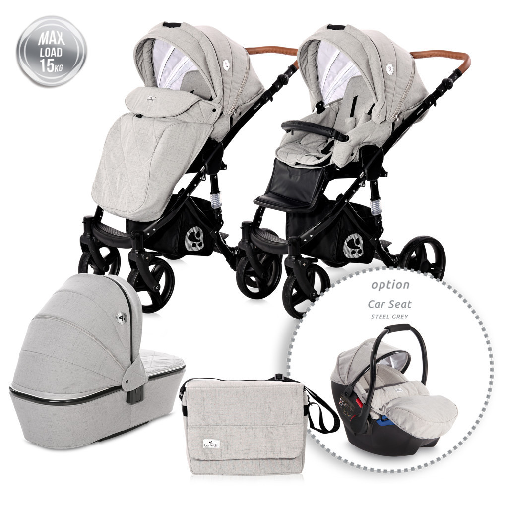 Könnyen átalakítható 3-az 1-ben multifunkciós babakocsivá a Lorelli Rimini Di Mare autóshordozó és adapter segítségével (nem a csomag része, külön vásárolható).