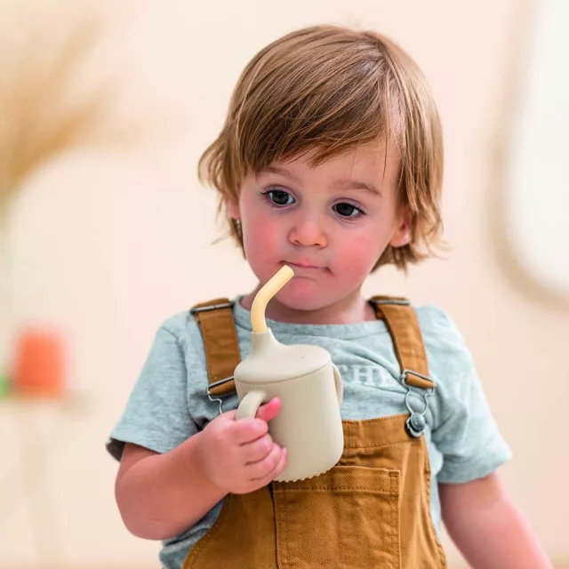 Ez a 150 ml-es, szilikonból készült itatópohár két kis fogantyúval, puha szívószállal és biztonsági záras fedéllel segít, hogy csöppséged magabiztosan igyon.