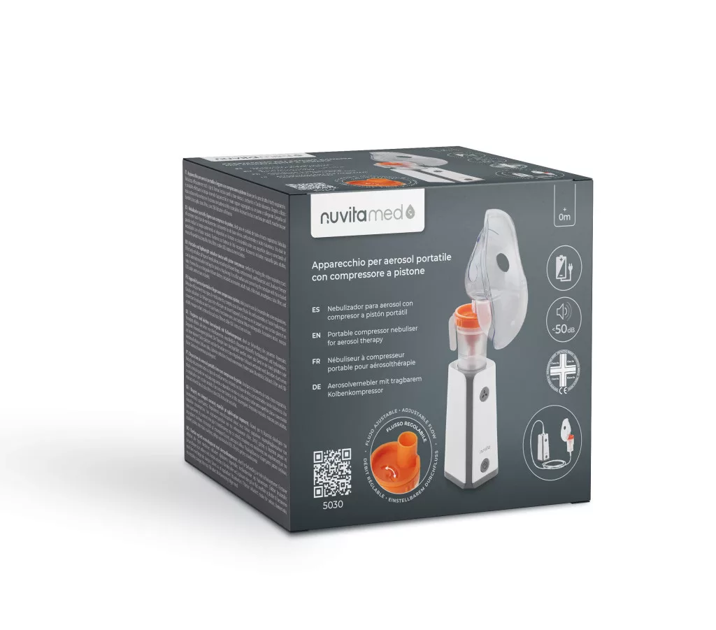 Ez a NuvitaMed hordozható kompresszoros inhalátora kompakt, könnyű, csendes és beépített újratölthető lítiumakkumulátorral van ellátva, így kényelmesen használható otthon, utazás közben vagy akár munkahelyen.