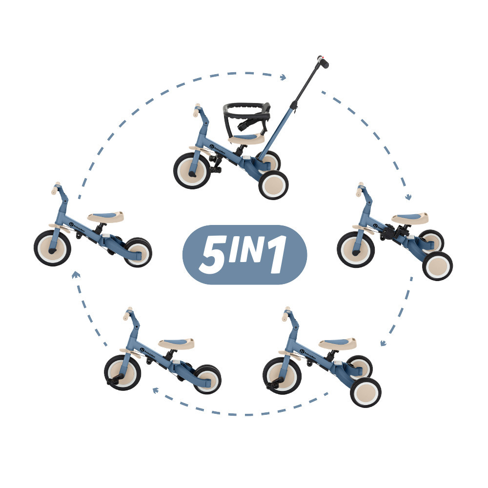 Csak egyszerűen: ez a tricikli egy igazi csodajárgány! Kezdetben tologatható, aztán futóbicikli, pedálos tricikli, egyensúlyozó bringa, és végül sima pedálos kerékpár – szó szerint öt funkció egy termékben. Mindegy, hová jutsz el vele, a jármű minden utadat élménnyé varázsolja.