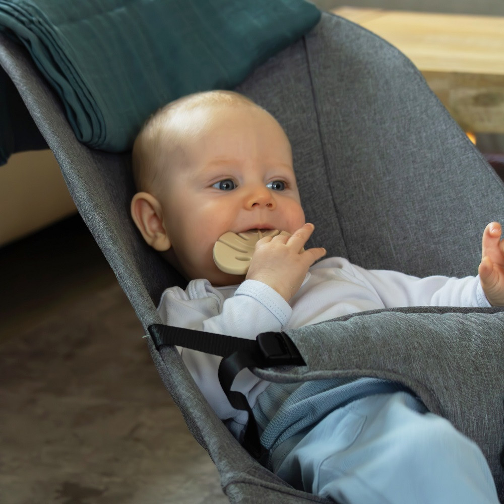 A puha, szilikon, levél alakú rágóka, legmagasabb minőségű, tartós anyagból készült, mely garantálja kisbabád biztonságát játék és fogzás közben. A rugalmas szilikon ideális érzékeny ínyéhez.