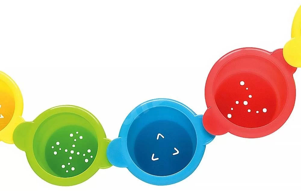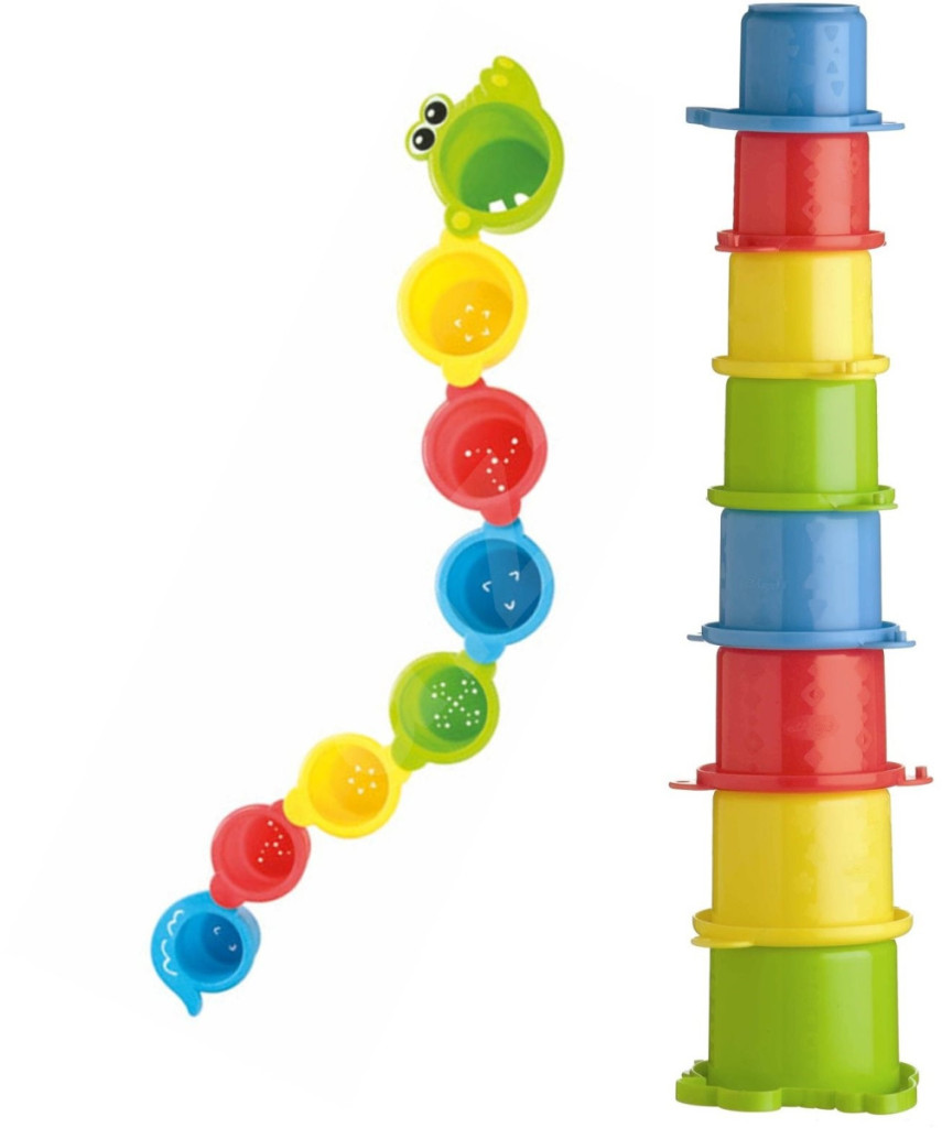 A készlet 8 különböző színű poharat tartalmaz amelyek alakja dombornyomott a tetején, ami nagyszerűen elősegíti a baba finommotoros képességeit, a kéz-szem koordinációt és a kognitív gondolkodást is. A poharak egymásba vagy egymásra is rakhatók, így tornyot lehet építeni, ha pedig az összes csészét összekapcsolják, egy vidám színes krokodilt kapnak.