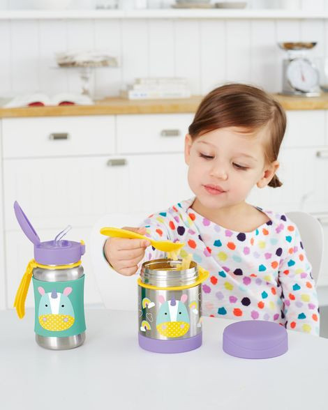 Ez a színes rozsdamentes acél tartály melegen vagy hidegen tartja a gyerek-méretű adagokat. Tárolja a kis méretű villát, ami egyben kanálként is használható. Az evőeszköz praktikusan felakasztható a termoszra, így menet közben is készen áll az étkezésre. A rozsdamentes acélnak köszönhetően 7 órán keresztül melegen tartja az ételt, vagy 5 órán át hidegen.