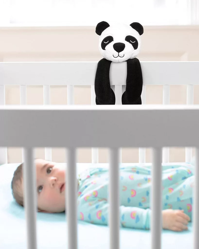 A plüss panda könnyedén a babaágyhoz rögzíthető (tépőzáras), ezáltal készen áll az éjszakai ébredésre is