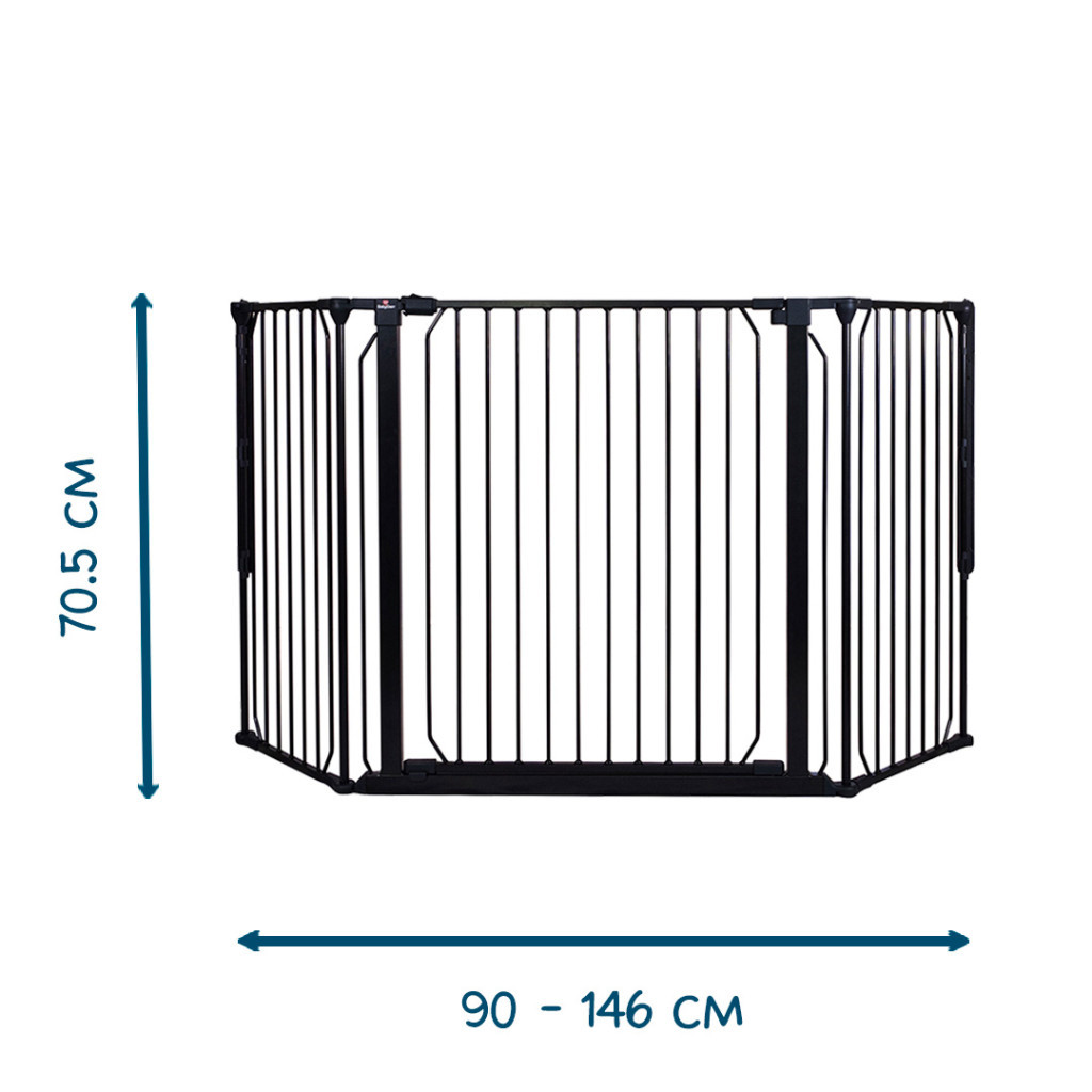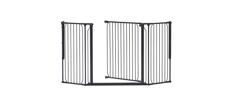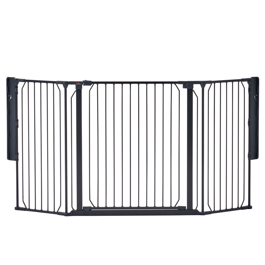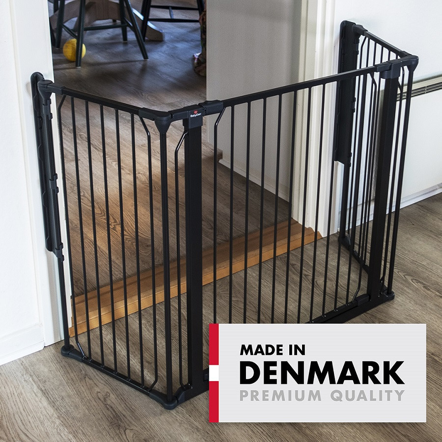 A fekete kültéri és beltéri BabyDan Carl Wide térkorlát jó védelmet nyújt lépcsőházak vagy nagyobb ajtók közelében.