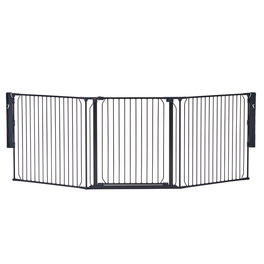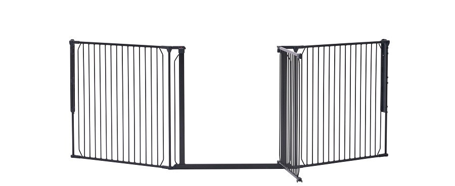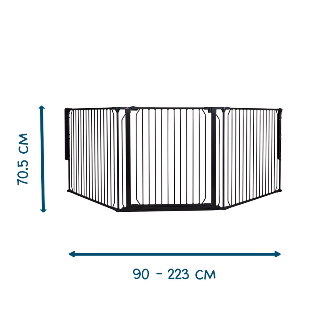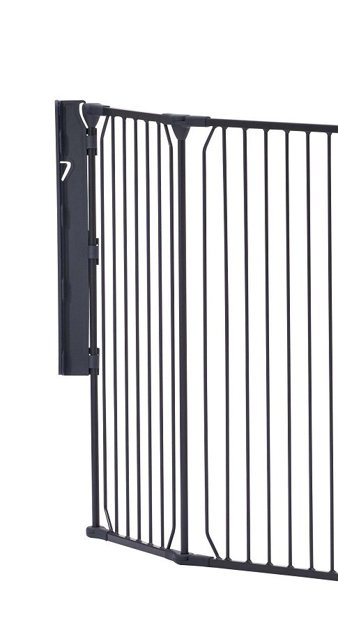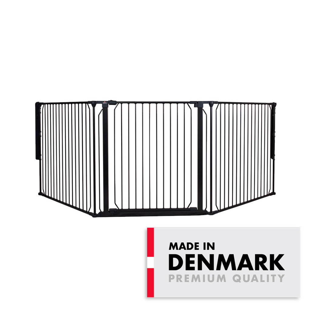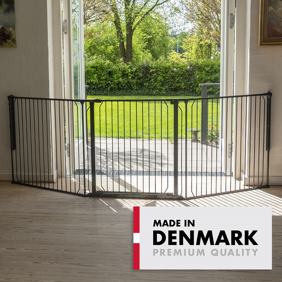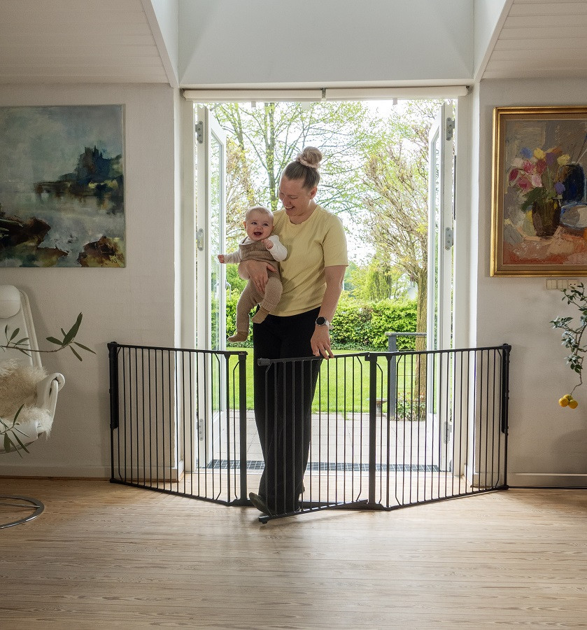 A fekete kültéri és beltéri BabyDan Carl X Wide térkorlát jó védelmet nyújt lépcsőházak vagy nagyobb ajtók közelében.