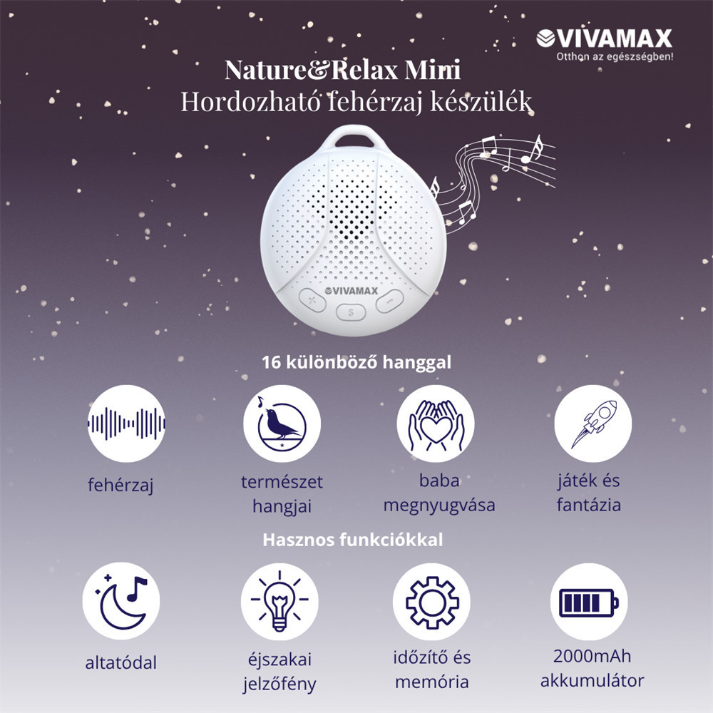 A Vivamax hang- és dallamterápiás készülék olyan hangokat bocsát ki, amelyek egyaránt alkalmasak felnőttek és gyermekek alvásminőségének javítására, gyorsabb elalvás elősegítésére. Továbbá hozzájárulhatnak a koncentráció növeléséhez, hiszen könnyebben kiszűrhetjük a külső zajokat.