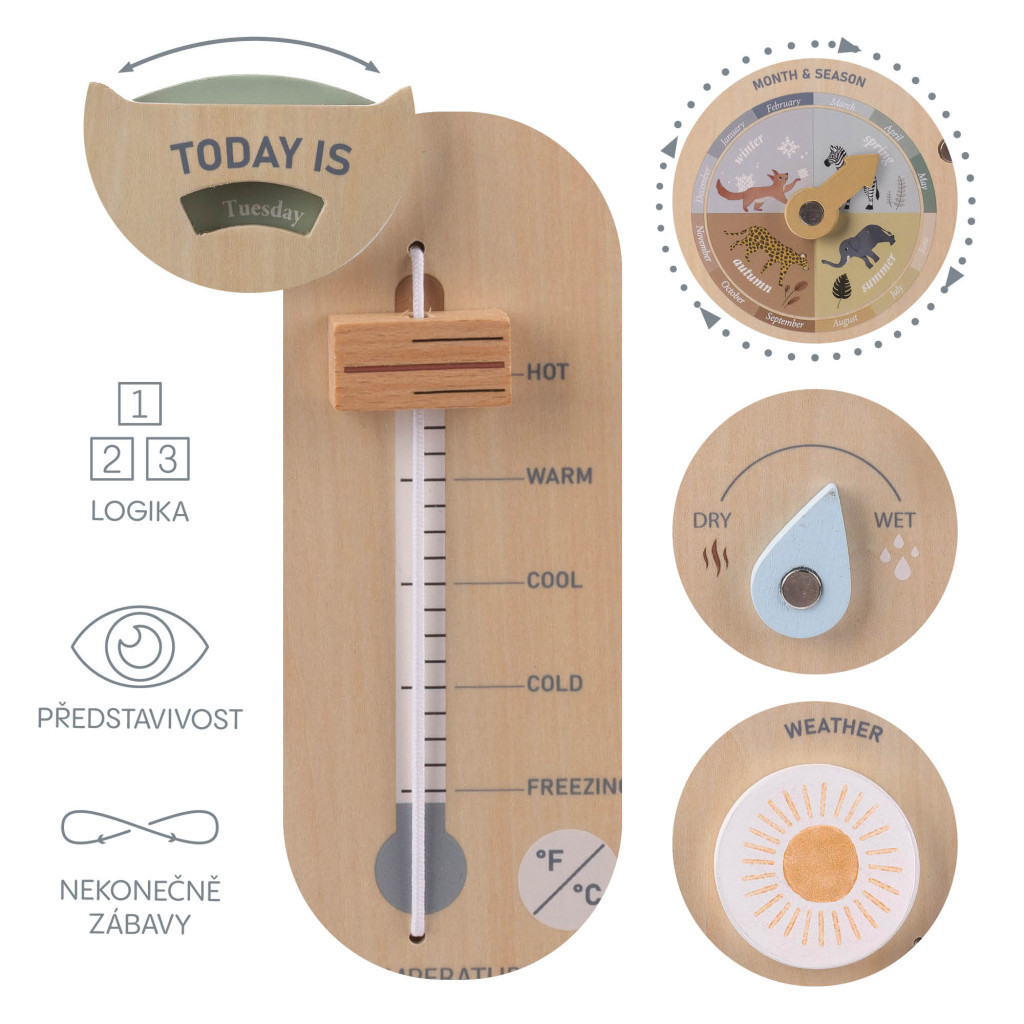 Az interaktív kialakítás ösztönzi a mindennapos használatot:válasszátok ki a napot, figyeljétek meg az aktuális időjárást,állítsátok be a páratartalmat és a hőmérsékletet.Mindeközben fejlődik a logikus gondolkodás, a finommotorika,a képzelőerő és a szókincs.