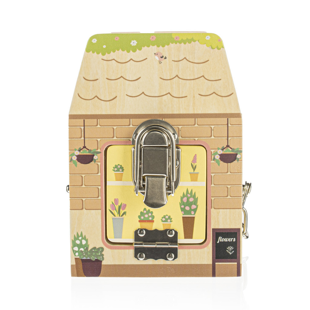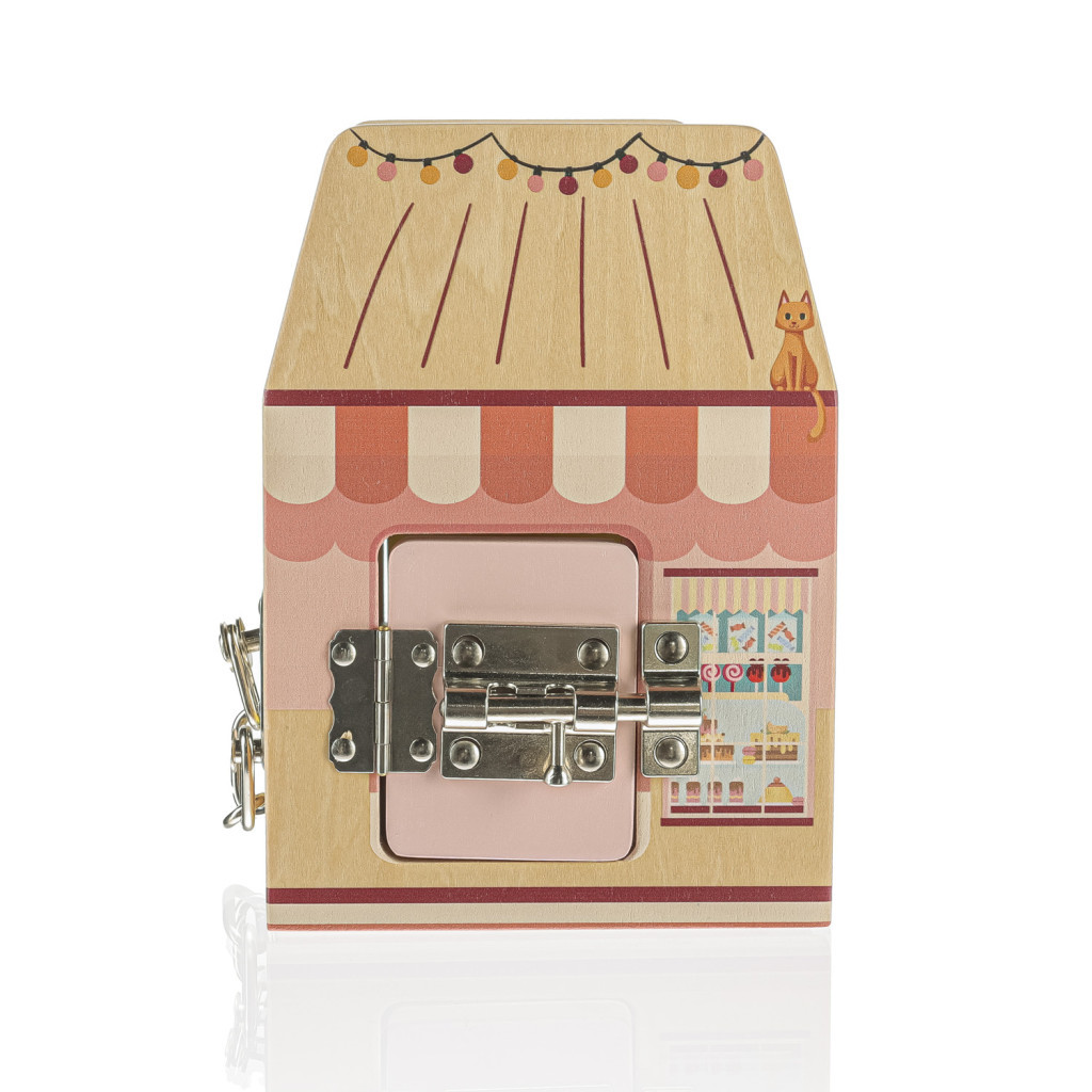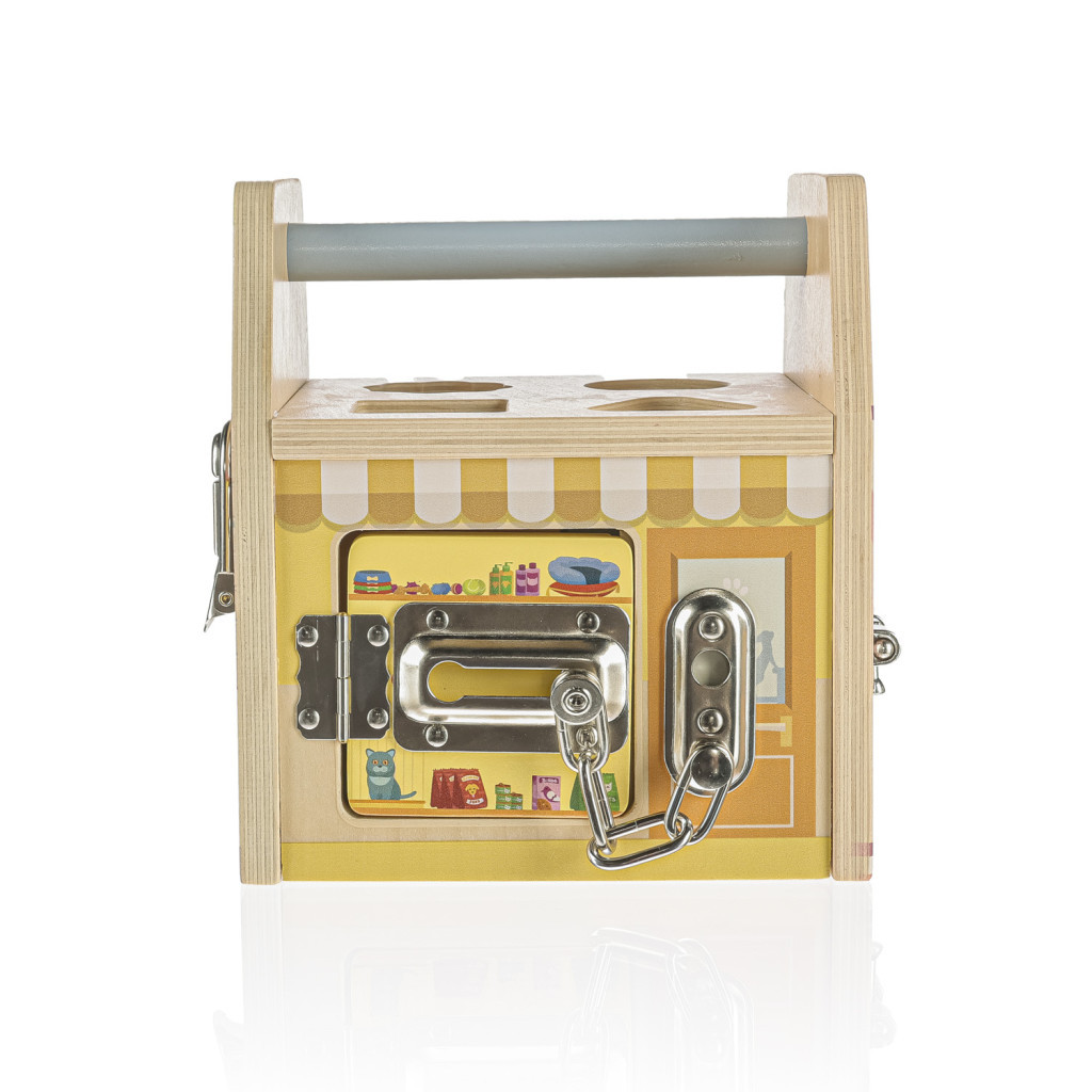 A fa kocka minden oldala egy-egy üzletet ábrázol, amelyek mindegyikét egy speciális zár védi a tolvajoktól. A zárakkal való játék közben a gyerekek fejlesztik logikai és térbeli érzékelésüket.