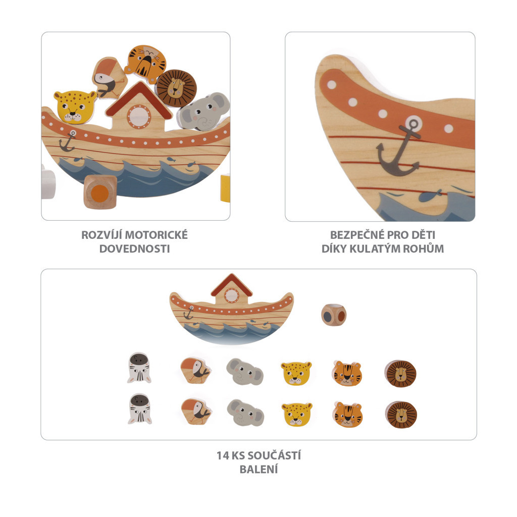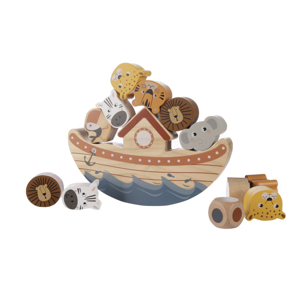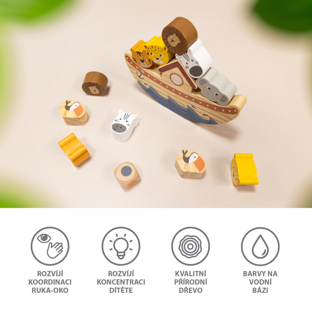 Játsszon egyedül vagy többen – gyerekek, felnőttek, nagyszülők – ez a szórakoztató játék mindenkit megnevettet! Egymás után helyezze fel az összes fából készült állatkát a bárkára, de vigyázat! Minél több állat van a fedélzeten, annál nagyobb az esélye, hogy a bárka felborul, vagy az állatok leesnek!