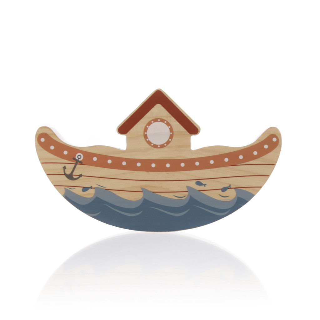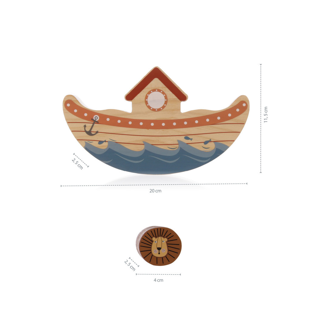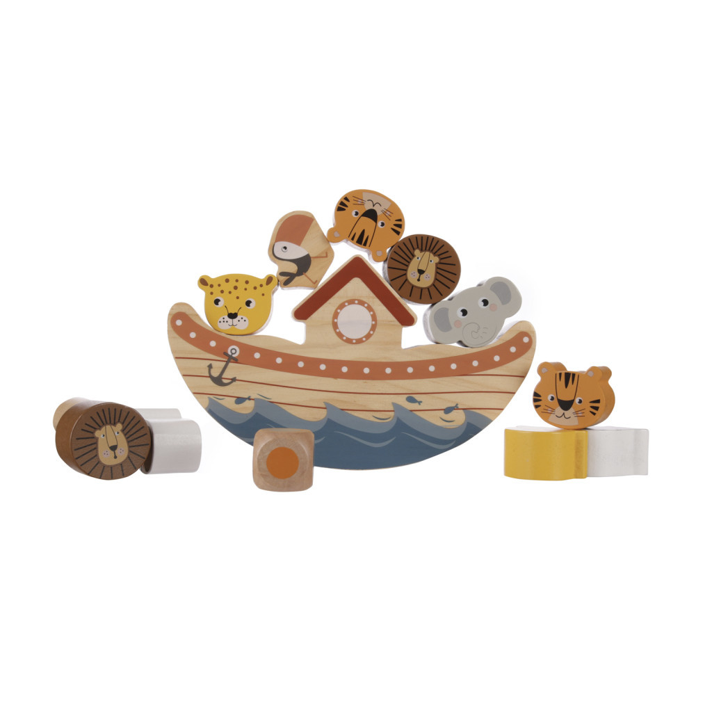Játsszon egyedül vagy többen – gyerekek, felnőttek, nagyszülők – ez a szórakoztató játék mindenkit megnevettet! Egymás után helyezze fel az összes fából készült állatkát a bárkára, de vigyázat! Minél több állat van a fedélzeten, annál nagyobb az esélye, hogy a bárka felborul, vagy az állatok leesnek!