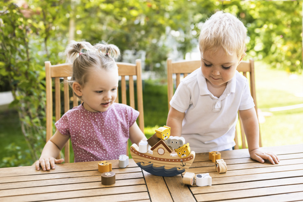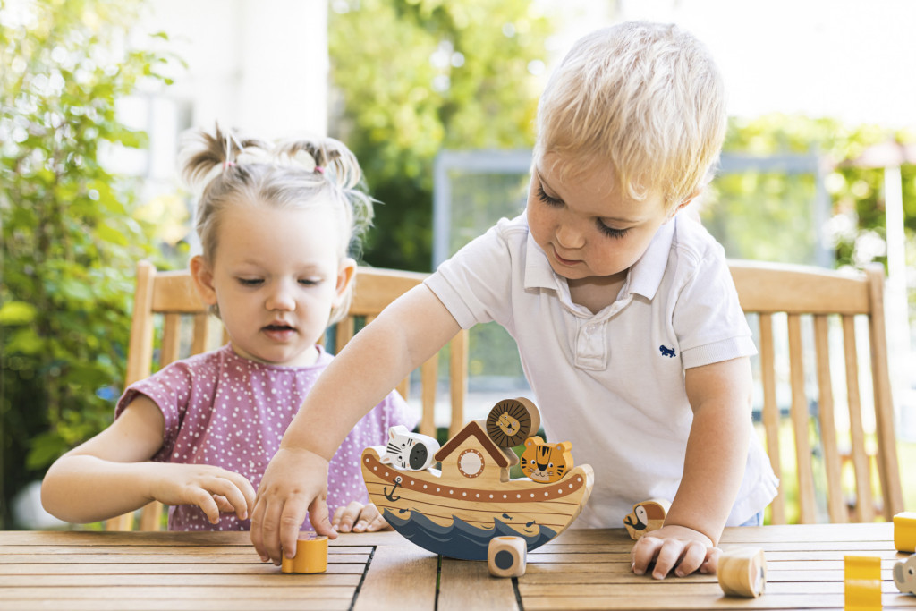 Hagyja, hogy a gyerekek felfedezzék, hogyan működik a gravitáció, és tanulják meg a térbeli érzékelést. Játékos módon sajátítják el, hogyan helyezzenek tárgyakat úgy, hogy egyensúlyban maradjanak. A játék egyedül is élvezhető, de ha többen játszanak, az veszít, akinek az állatkái először leesnek a bárkáról.