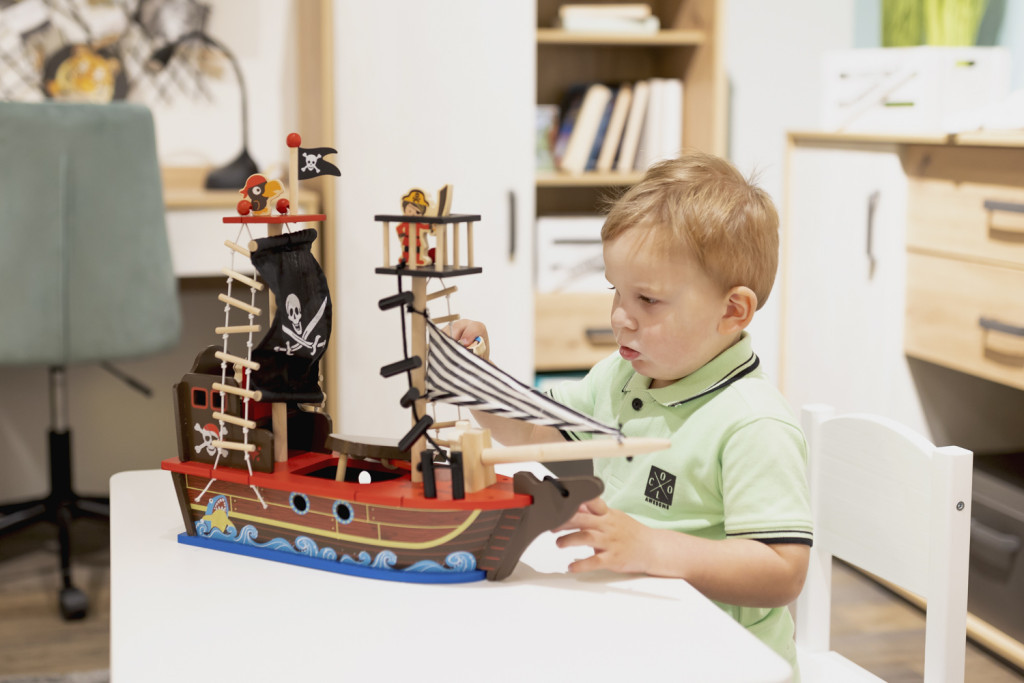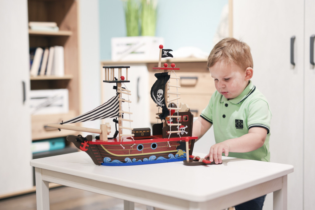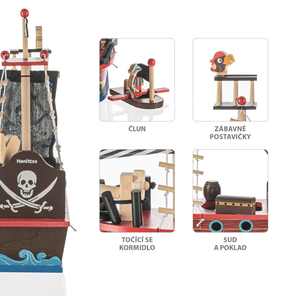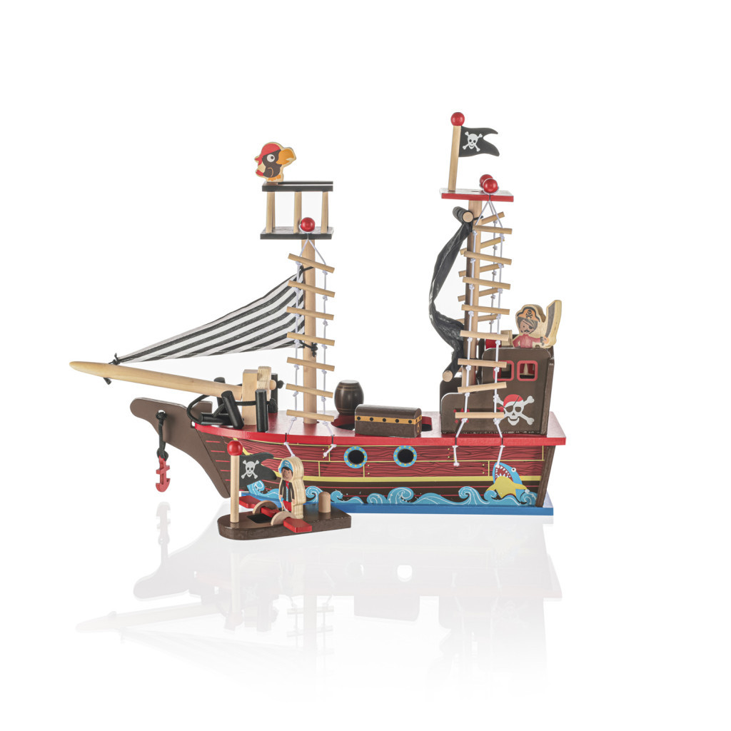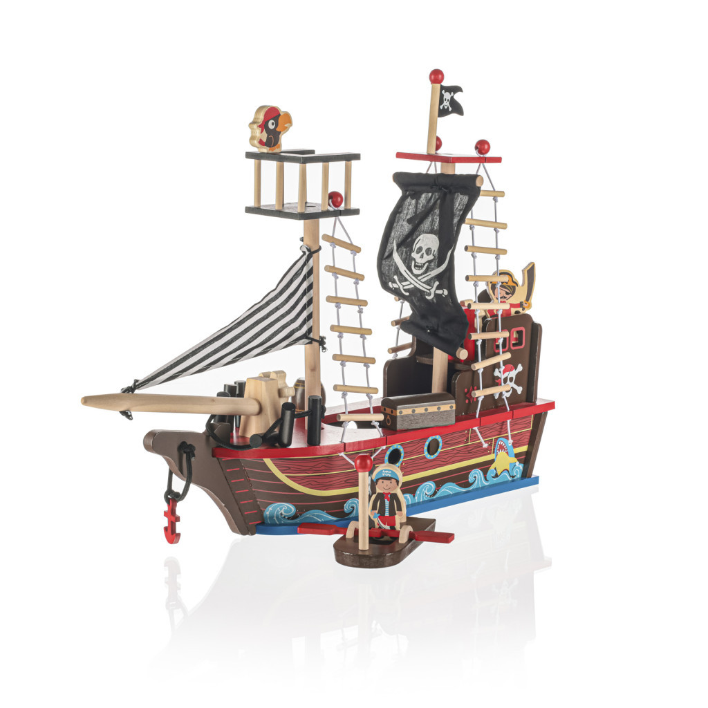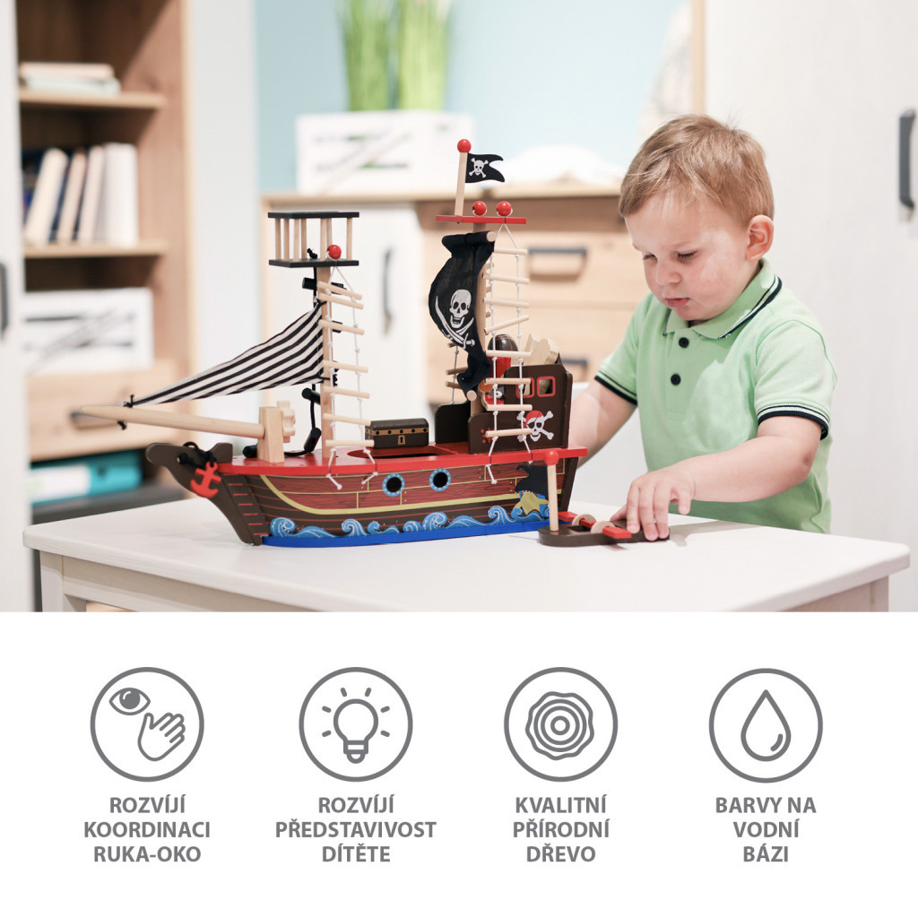 A fából készült kalózhajó számtalan történetet mesél el, így a végtelen szórakozás forrásává válik, és kis kalózának kedvenc játékává lesz. A hajó ideális eszköz a gyermek fejlődésének támogatására. Biztonságos, nem mérgező festékkel, gyönyörű részletekkel és kidolgozással készült, így 3 éves kortól ajánlott. Minőségi fából készült, nemcsak szórakozást nyújt, hanem dekorációként is felhasználható.