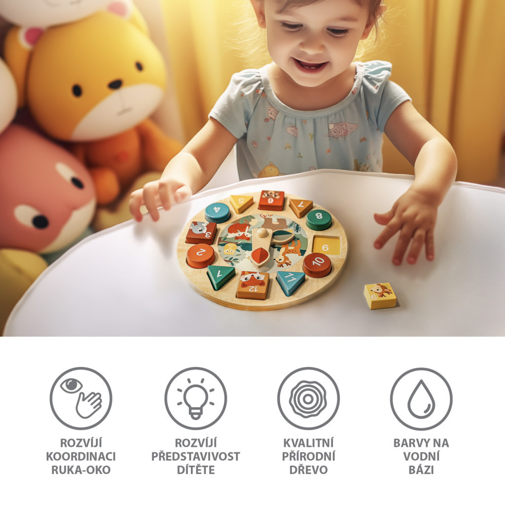 Kéz-szem koordináció, logikus gondolkodás, formák, állatok, színek, órák, számok tanulása, vízbázisú, nem toxikus festékek, szálkamentes természetes fa, formaldehidmentes ragasztó – mindez a Fa aktivitási óra része.