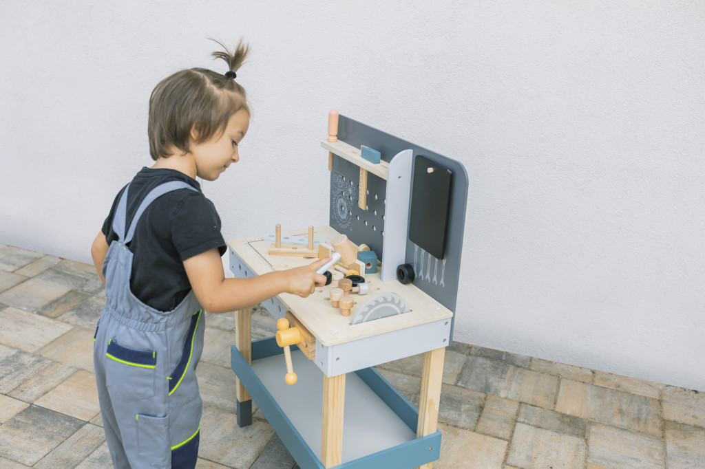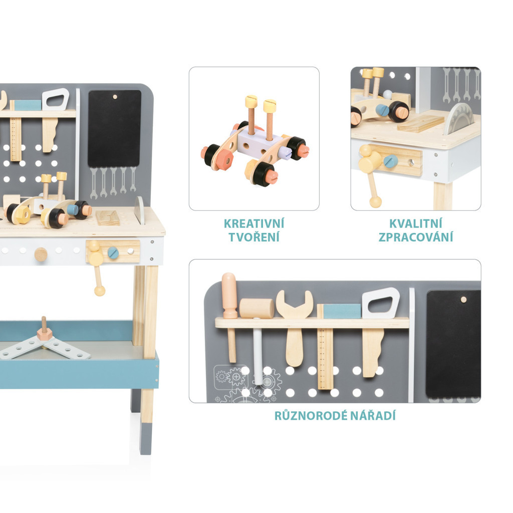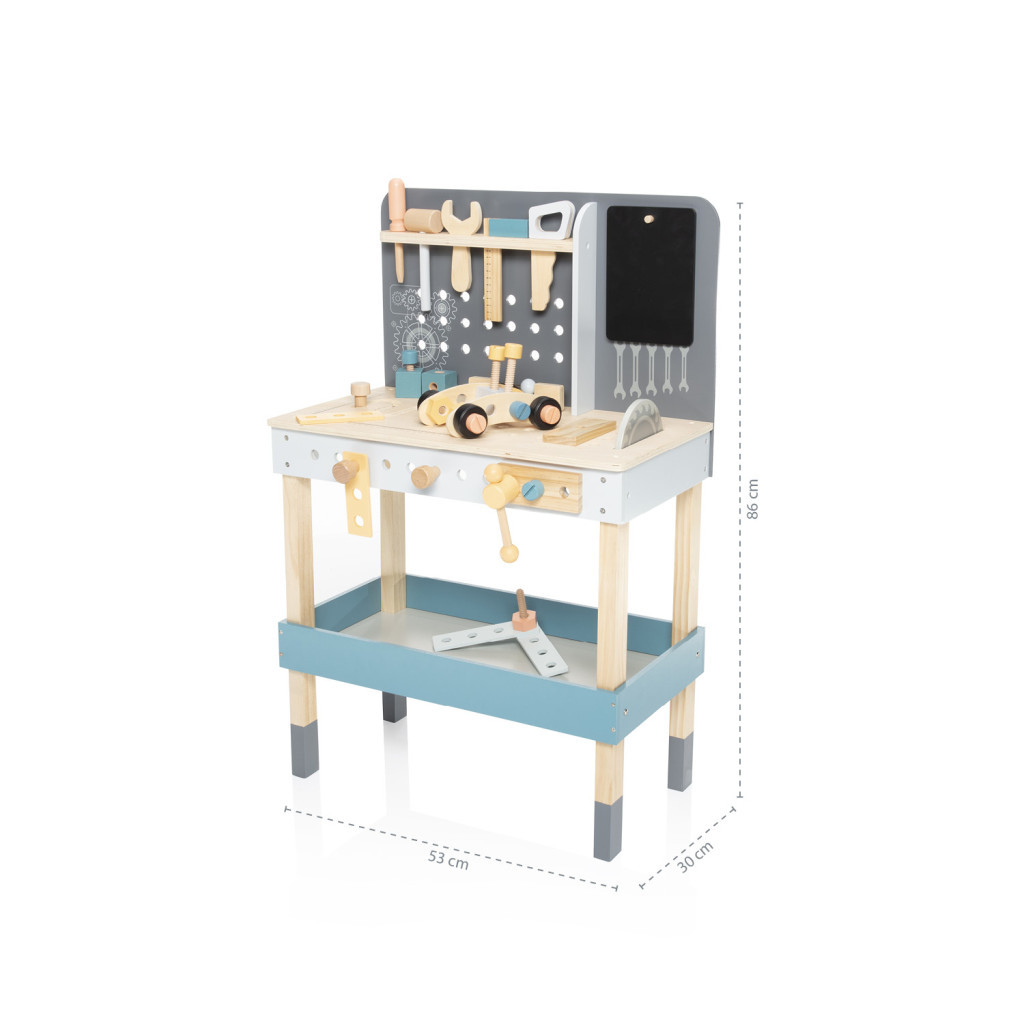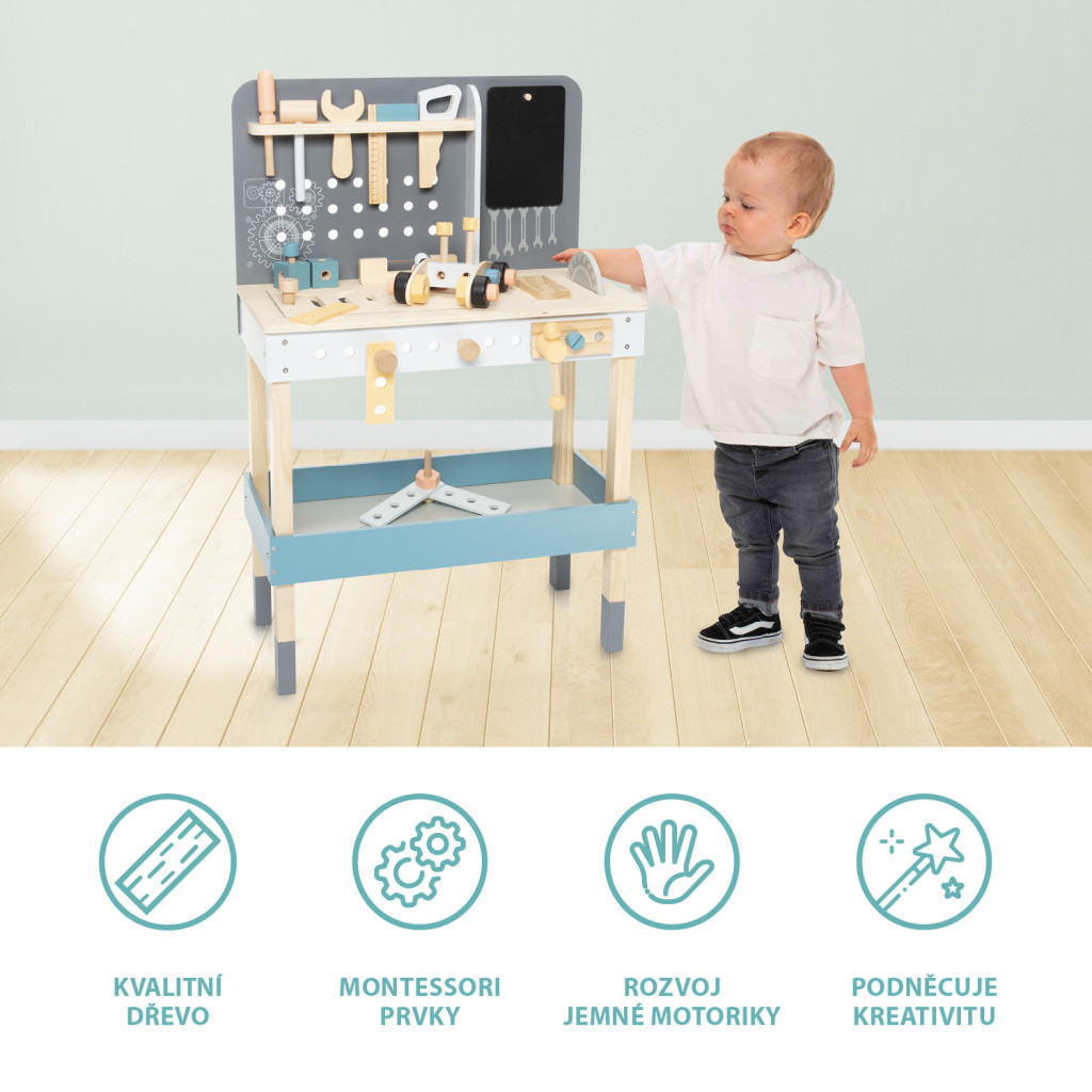 Tágas munkapad, kiváló minőségű fa, vízbázisú festékek, számtalan játéklehetőség – ez a nagy fa munkapad.