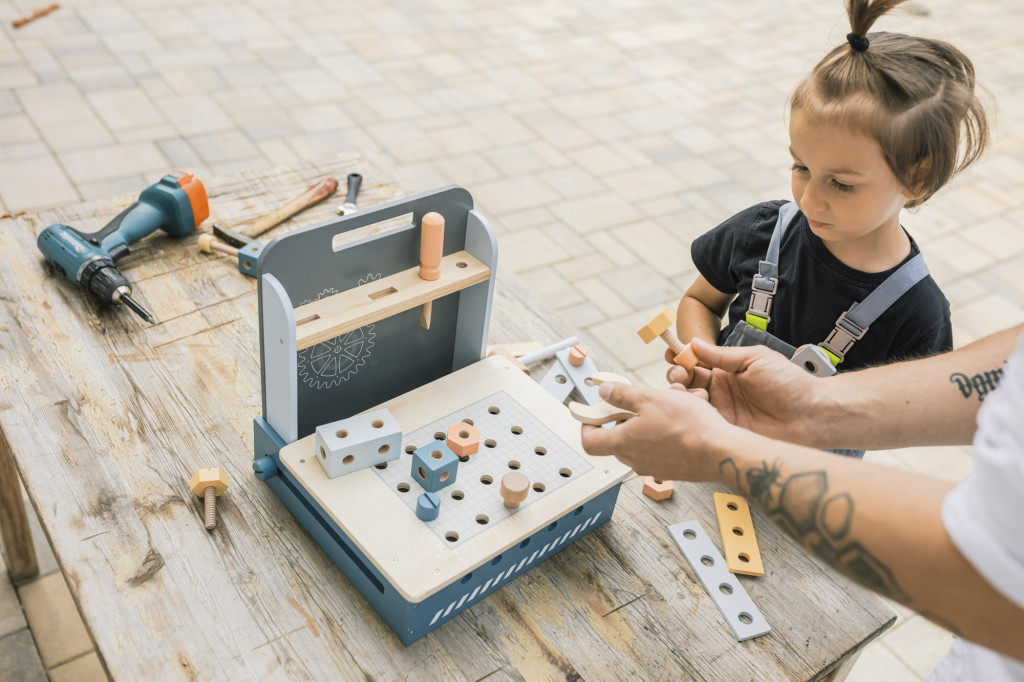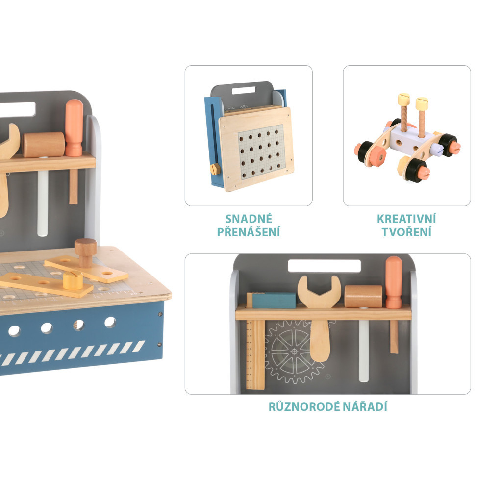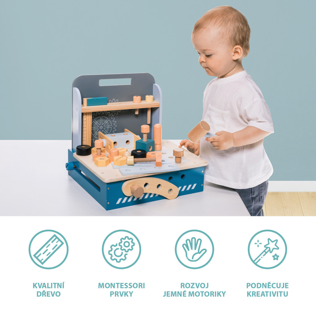 Kompakt méret, kiváló minőségű fa, vízbázisú festékek, rengeteg elem, hosszan tartó szórakozás – ez a fa összecsukható munkapad.