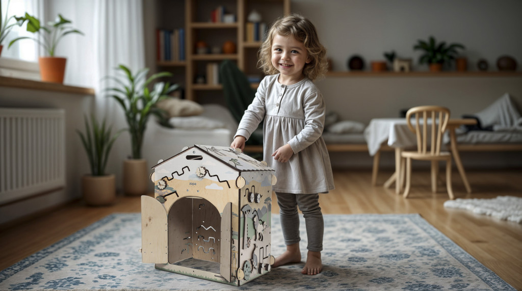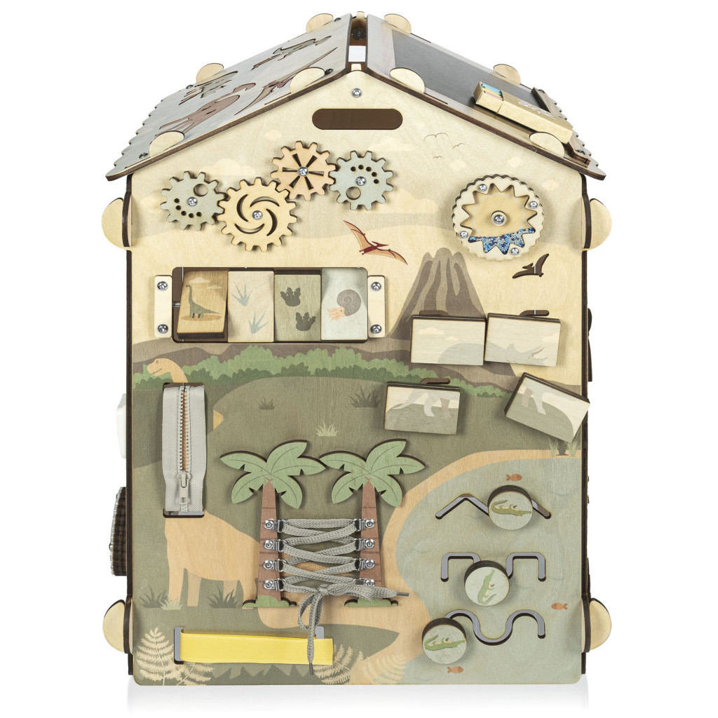 A házikó tartalmaz fűzőket, befűzős elemeket, cipzárt, fogaskerekeket, labirintusokat és mechanikus kapcsolót is.