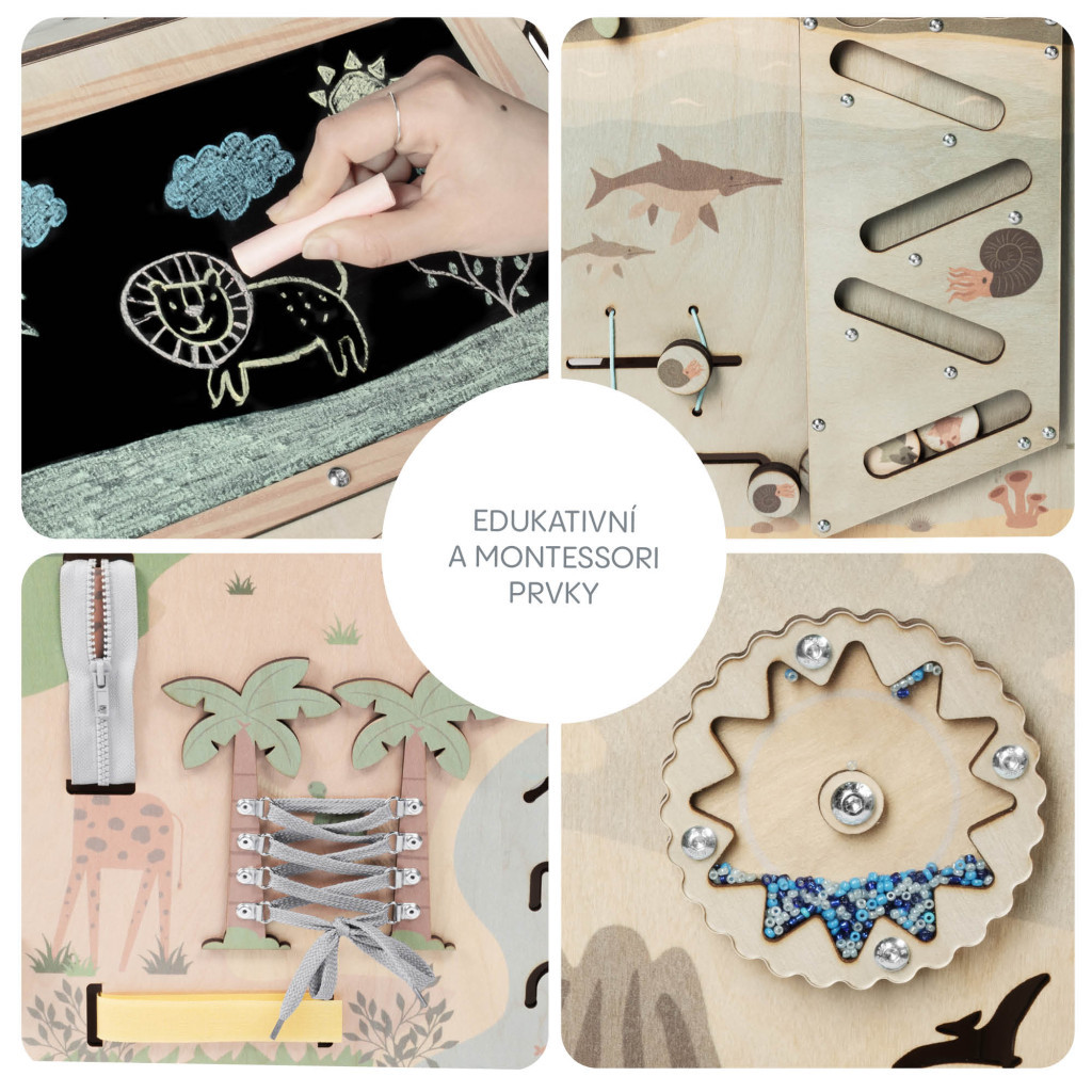 A forgatható fa elemek állatnyomokat és dinoszaurusz formákat rejtenek. A képek párosítása fejleszti a logikát és a megfigyelőképességet.