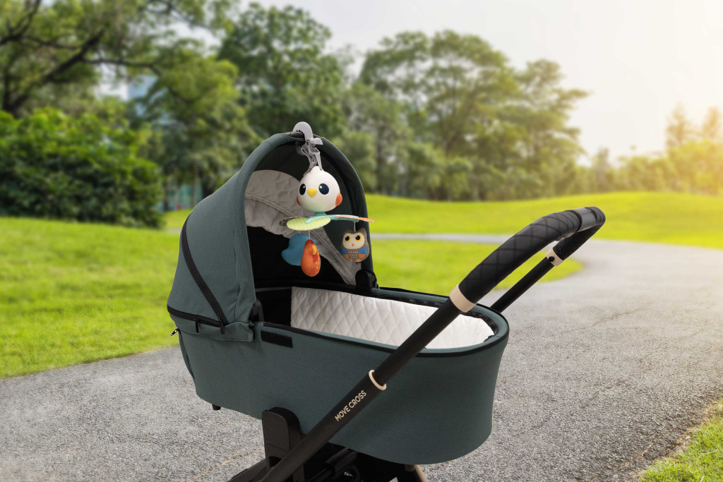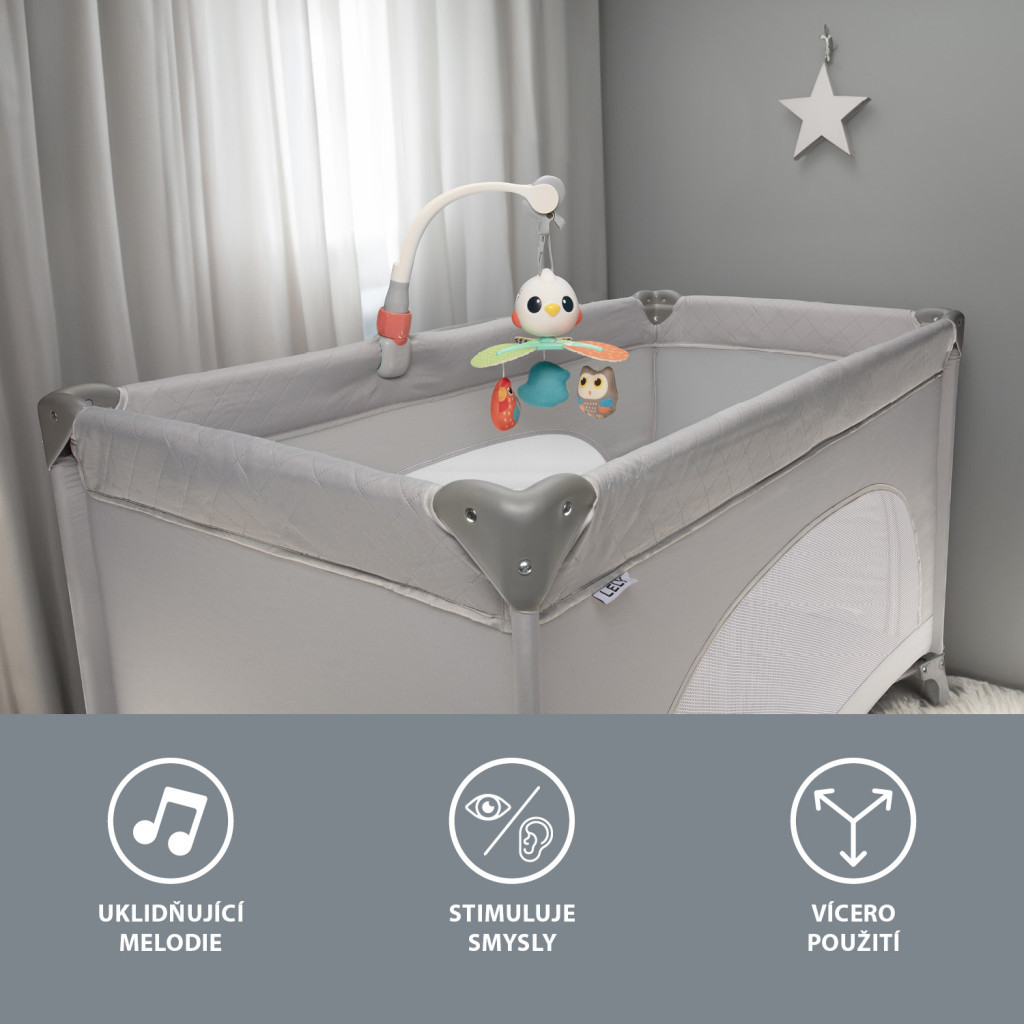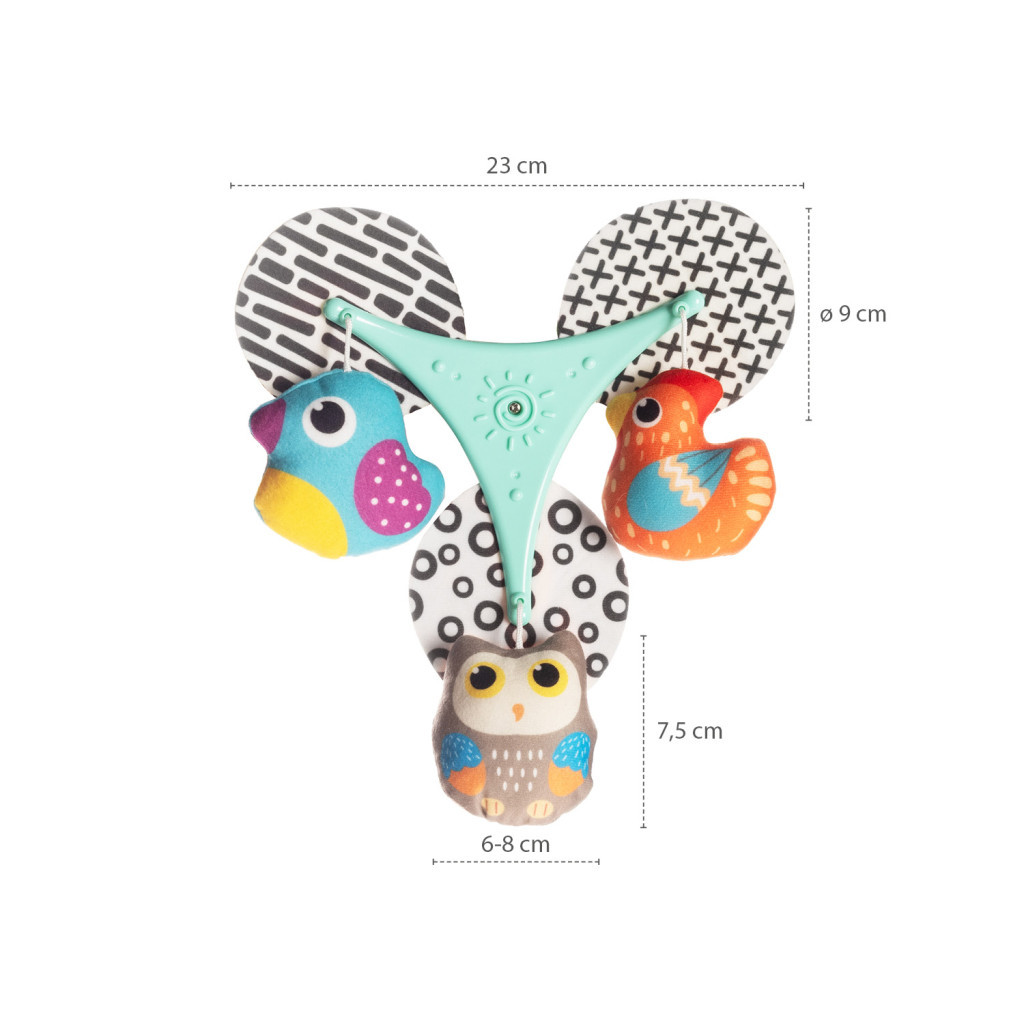 A forgó játék nemcsak vizuális ingert nyújt, hanem önállóan is használható. Három rögzítési lehetőséggel – autósülésre, kiságyra vagy babakocsira – a gyermek mindig körül lesz véve szórakoztató elemekkel.