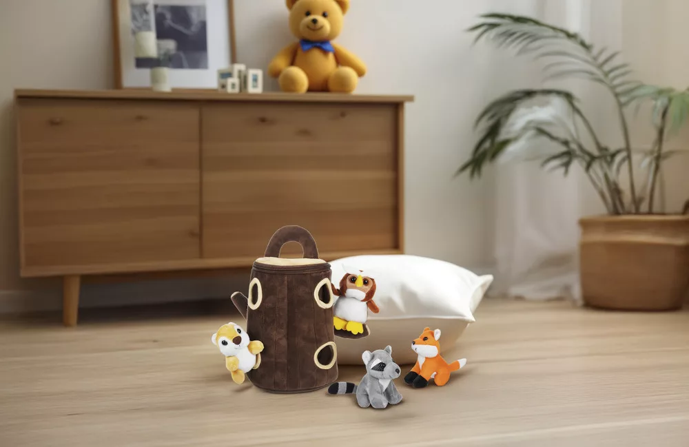 Egy aranyos plüss házikó állatbarátokkal, amely szórakoztatja a gyerekeket, miközben támogatja az érzékszervi és mozgásfejlődésüket.