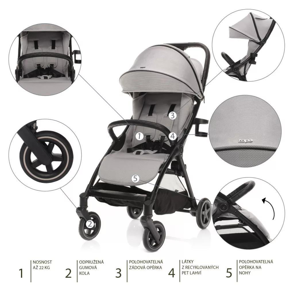 Könnyű szerkezet, állítható háttámla, állítható lábtartó, meghosszabbítható kupola szellőzőablakokkal, 5 pontos öv mágneses csattal, lábfék, rugózott gumikerék, felnyitható kapaszkodó, egykezes összecsukás – ez a Quiq2 babakocsi. Születéstől 22 kg-ig alkalmas gyermekek számára.