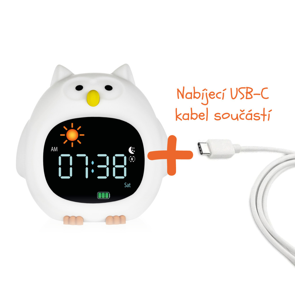 Egy aranyos gyerek ébresztőóra éjszakai fénnyel és nyugtató hangokkal, amely segíti a kicsiket az elalvásban és az ébredésben – biztonságosan, játékosan és mosollyal.