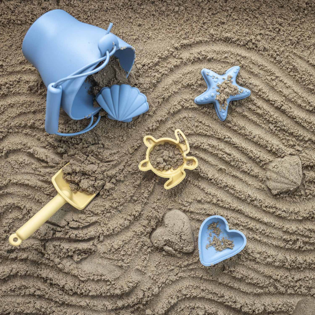 Élelmiszeripari szilikon, támogatja a gyermek motoros képességeinek fejlődését, vödör, fedél, lapát és 5 homokozóforma, 6 hónapos kortól alkalmas – ez a szilikon homokozószett.