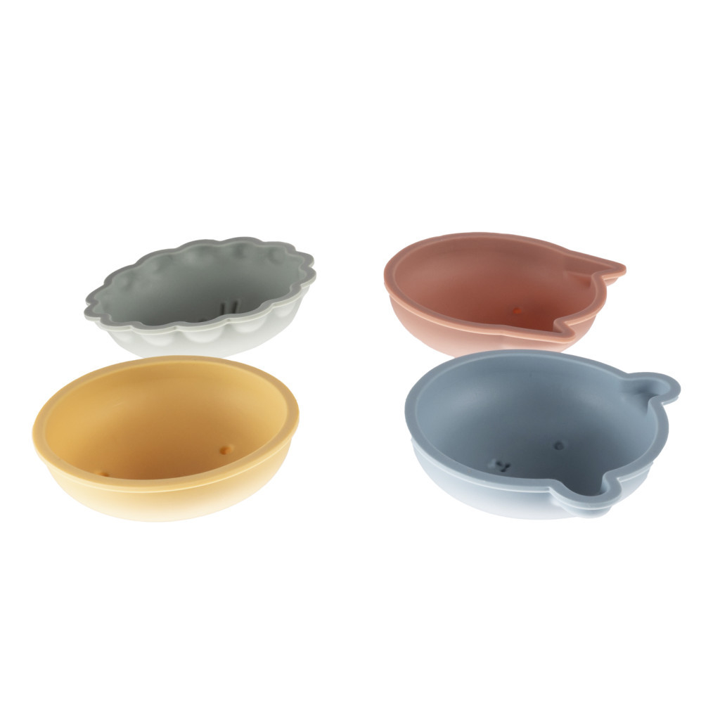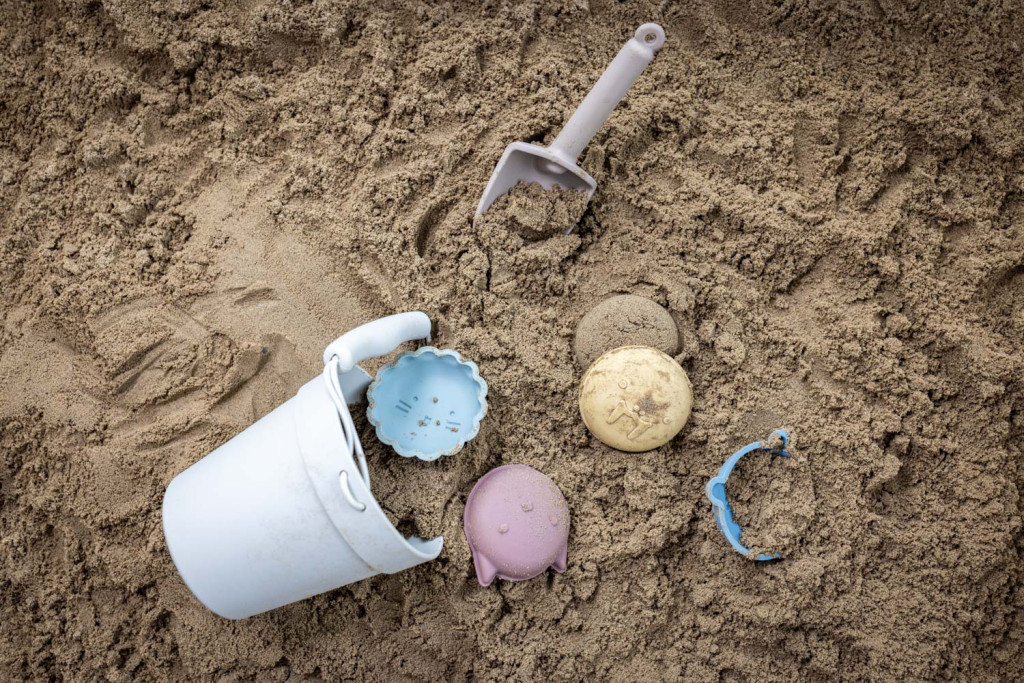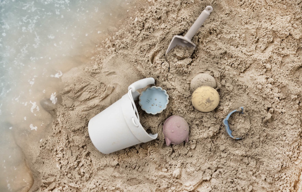 Élelmiszeripari szilikon, támogatja a gyermek motoros képességeinek fejlődését, vödör, fedél, lapát és 5 homokozóforma, 6 hónapos kortól alkalmas – ez a szilikon homokozószett.