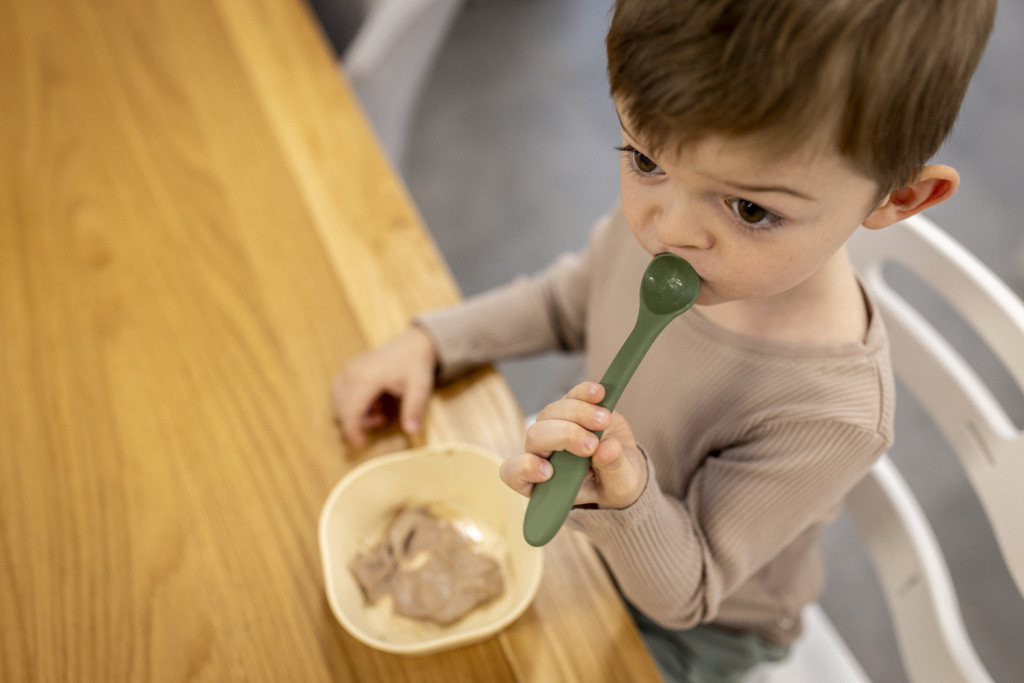 Szilikon kanál a baba biztonságos etetéséhez. Kiváló minőségű élelmiszer-minőségű szilikonból készült, puha és kíméletes a babaínyekhez. Tökéletes az első falatokhoz.