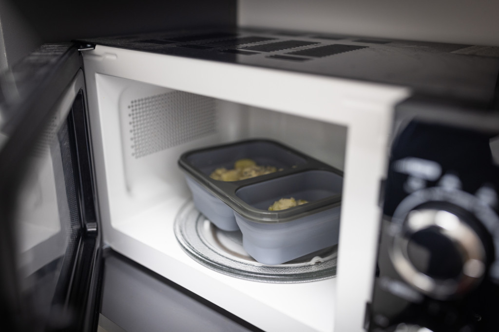 Élelmiszeripari szilikon, összecsukható, 2 különálló rekesz, jól záródó fedél, mikrohullámú sütőben használható, beépített rekesz az evőeszközöknek, evőeszköz a csomag része – ez a szilikon uzsonnás doboz evőeszközökkel.
