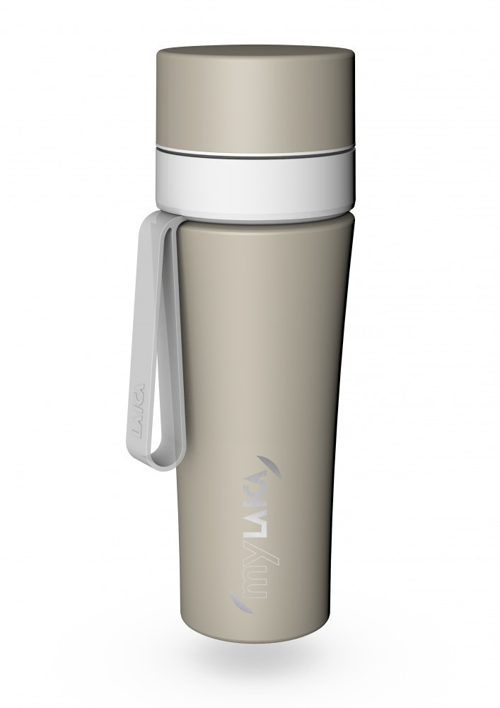 myLaica rozsdamentes matt bézsre festett fast disk rendszerű vízszűrő kulacs pánttal, 0,55 literes